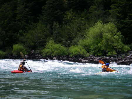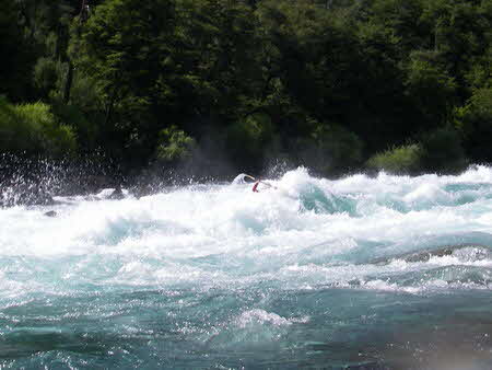 Der Futaleufu ( in Mapuche großer Fluß ) gehört zu den weltbesten Kajakflüssen. Er bietet auf 50 km faires WW vom Feinsten zwischen WW II - V+ , mit Spielmöglichkeiten ohne Ende. Wir hatten Mitte Januar 2008 einen relativ niedrigen Wasserstand, ca 250 m3/s. Sichere Rolle ist Voraussetzung auf allen Abschnitten. Der Futaleufu wird grob in 4 Abschnitte unterteilt: Inferno Canyon: WW WW IV - V ( Zeta V+, wird meistens umtragen ); Terminator-Section, WW III - V+, wobei der Terminator 1 km WW V+ leicht rechts umtragen werden kann; Puente a Puente III - IV+, ist der am meist befahrene Abschnitt der uns auch nach der 10. Befahrung noch nicht langweilig wurde :-) El Marcal ist der unterste Abschnitt, erst kommen 2 Stromschnellen; Mas o Menos WW IV+ und Casa de Piedra WW V, dann III - I abnehmend, Einstieg ist auch direkt nach der letzten schweren Stelle möglich. Ab Casa Amarillo Wanderpaddeln bis in den Lago Yelcho, oder auch bis ins Meer. Individualpaddler sind gut aufgehoben am günstig gelegenen Camping Cara del Indio. Flußführer: Futaleufu Whitewater von Tyler Curtis, sehr detailliert, empfehlenswert.